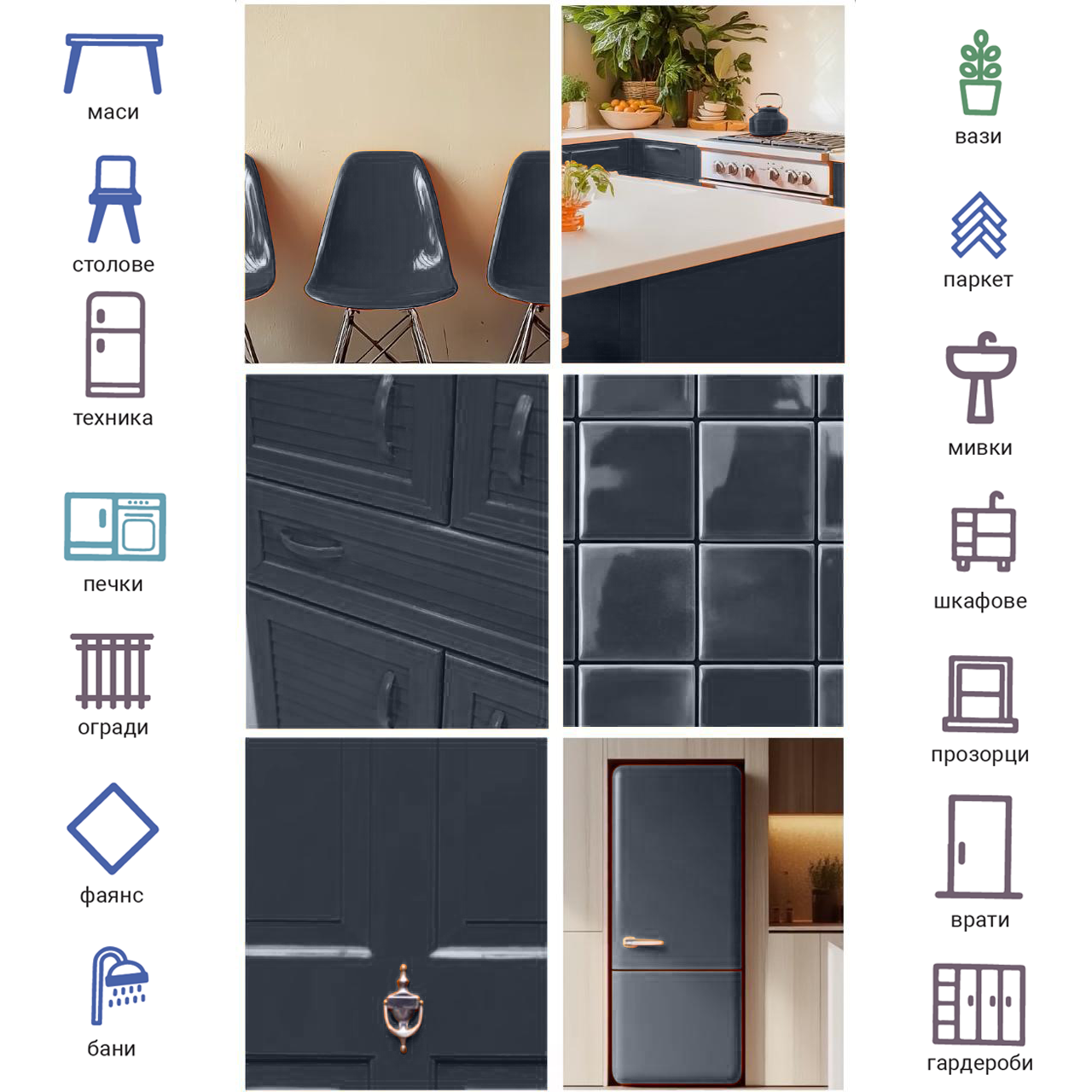 - Метални повърхности: Бяла техника, стоманени врати, радиатори, парапети.