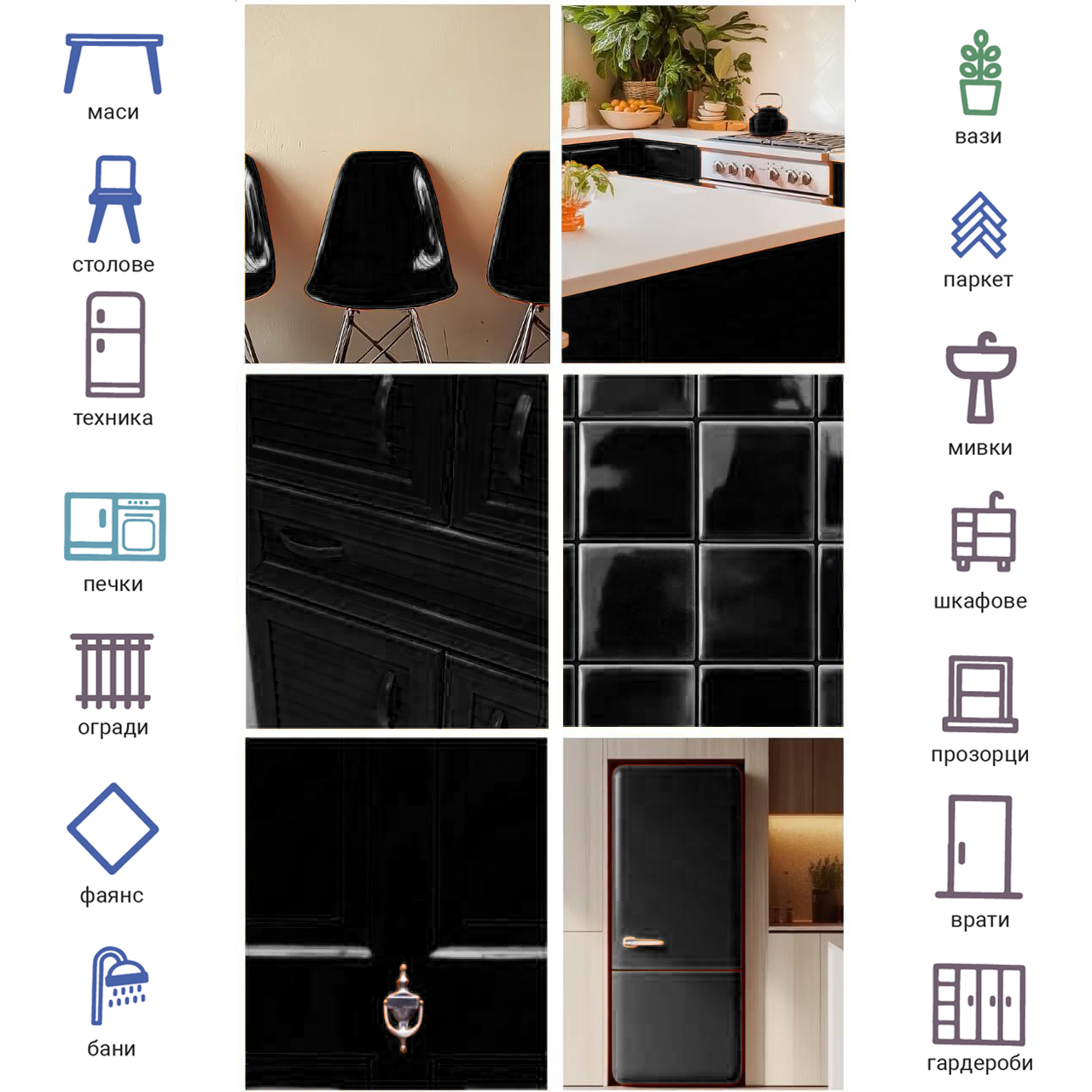 - Дървени повърхности: Мебели, врати, кухни, бани, ламинирани и масивни панели.