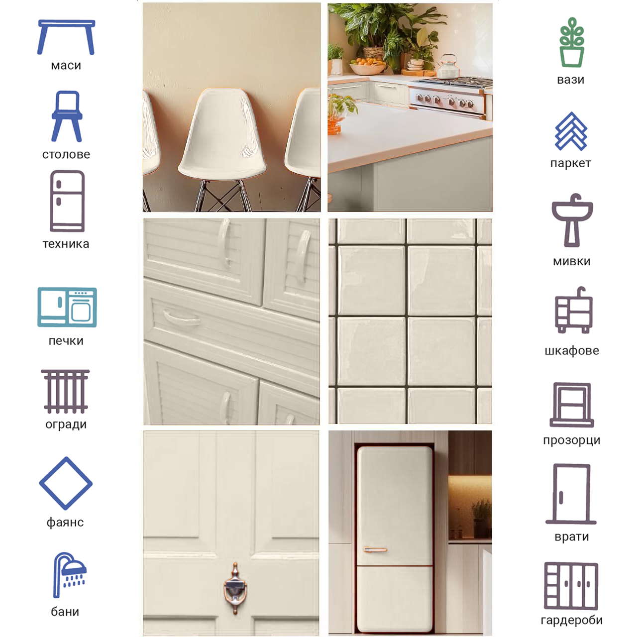 - Дървени повърхности: Мебели, врати, кухни, бани, ламинирани и масивни панели.