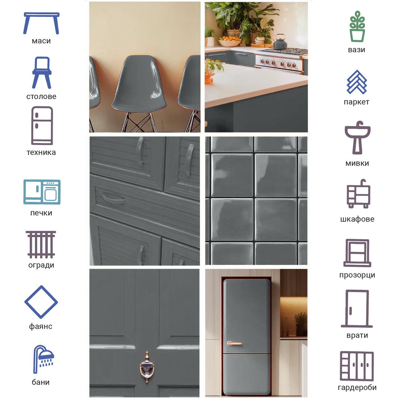 - Метални повърхности: Бяла техника, стоманени врати, радиатори, парапети.