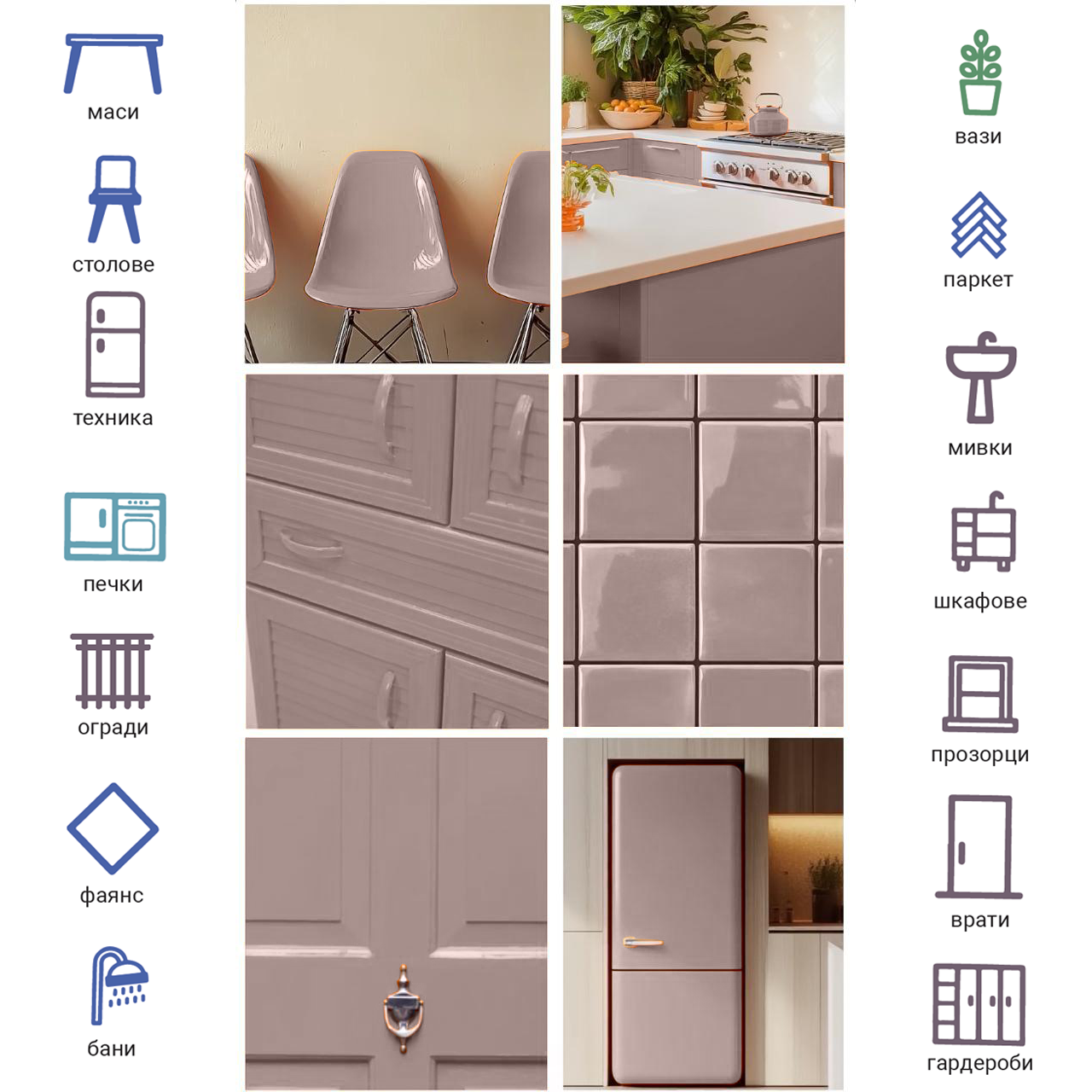 - Дървени повърхности: Мебели, врати, кухни, бани, ламинирани и масивни панели.